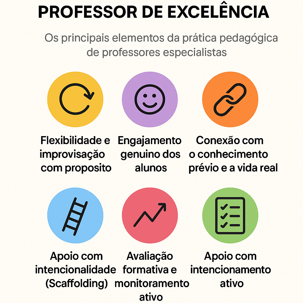 A prática pedagógica do professor de excelência é estratégica, reflexiva, centrada no aluno e constantemente adaptada em tempo real.